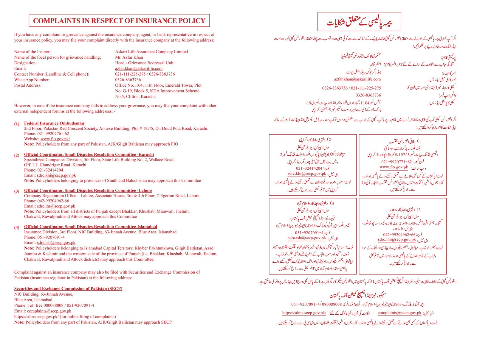 At Askari Life, we aim to provide the best customer service experience to all our clients, hence to simplify the process of complaint resolution, we have a dedicated forum where you can simply reach out to the designated person related to your issue.